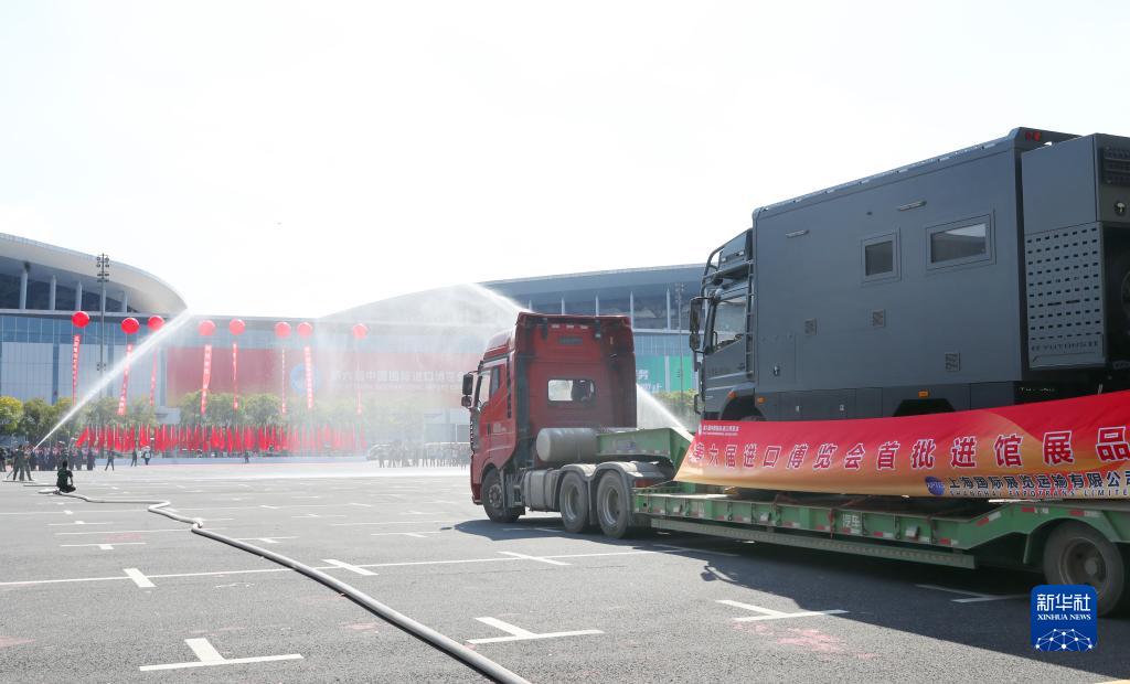 10月24日,第六屆進(jìn)博會(huì )首批展品進(jìn)館儀式在國家會(huì )展中心(上海)舉行,這是裝載首批進(jìn)館展品的卡車(chē)在儀式上駛過(guò)歡迎水門(mén)。