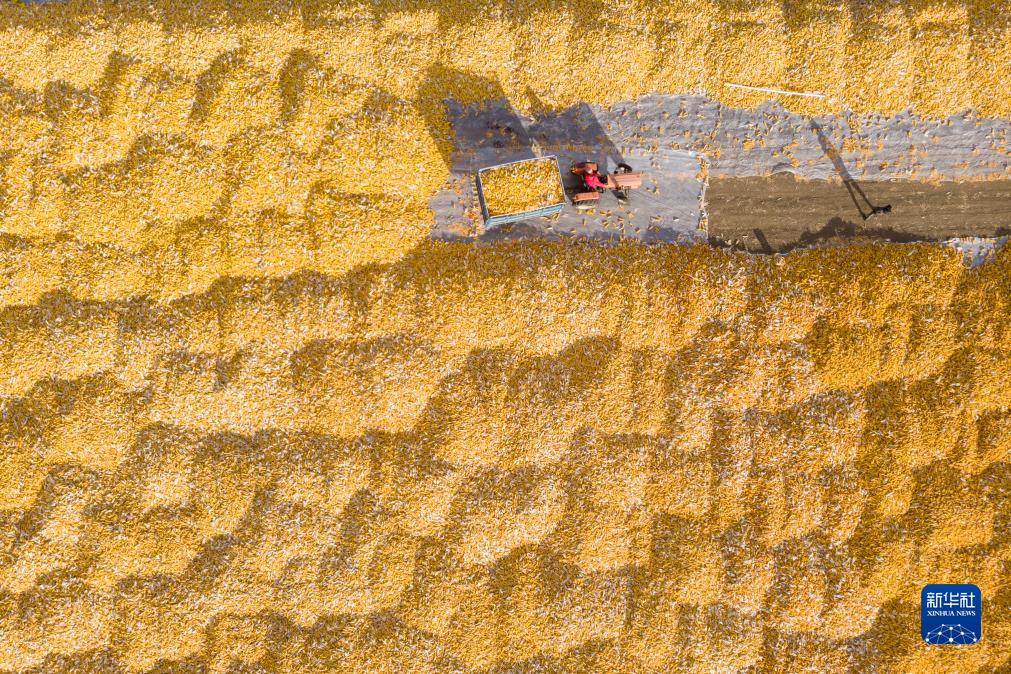 10月19日,在黑龍江省肇東市五里明鎮東升村,農民把收獲的玉米運到當地農業(yè)合作社指定的地點(diǎn)進(jìn)行晾曬(無(wú)人機照片)。