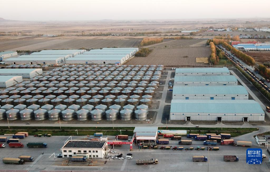 這是10月11日拍攝的送糧車(chē)在富錦市一大型糧食倉儲加工企業(yè)內排隊賣(mài)糧(無(wú)人機照片)。