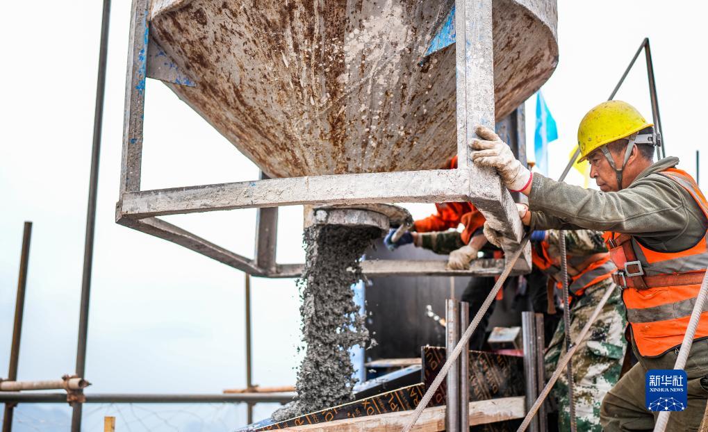10月24日,工人在花江峽谷大橋5號主塔上進(jìn)行施工。