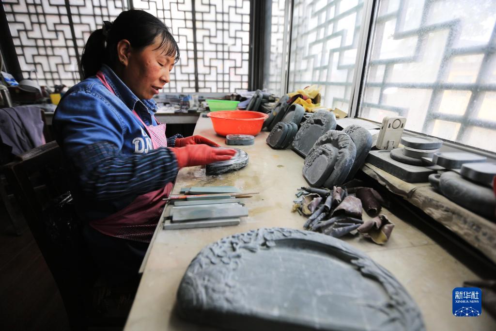 10月24日,藝人在甘肅省定西市臨洮縣洮硯藝術(shù)館打磨洮硯。