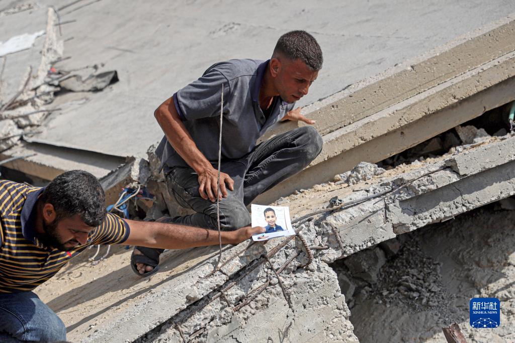 10月24日,在加沙地帶南部城市汗尤尼斯,一名男子手持一名兒童的照片在遭以色列襲擊的建筑廢墟進(jìn)行搜救。