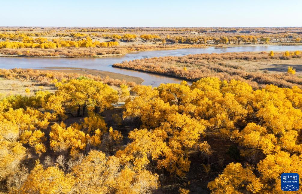 這是黑河岸邊的胡楊林(10月24日攝,無(wú)人機照片)。