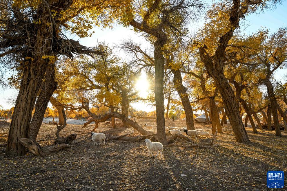 10月24日,羊群在胡楊林里覓食。