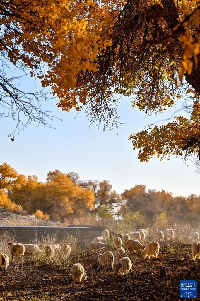 10月24日,羊群在胡楊林里覓食。