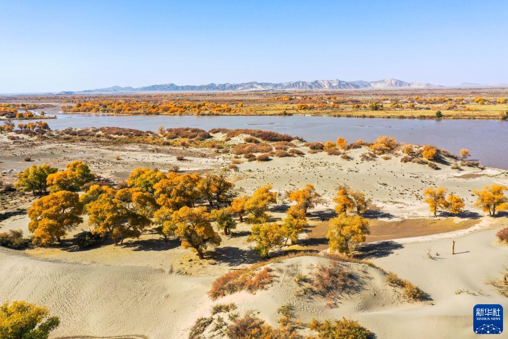 這是黑河岸邊的胡楊林(10月24日攝,無(wú)人機照片)。