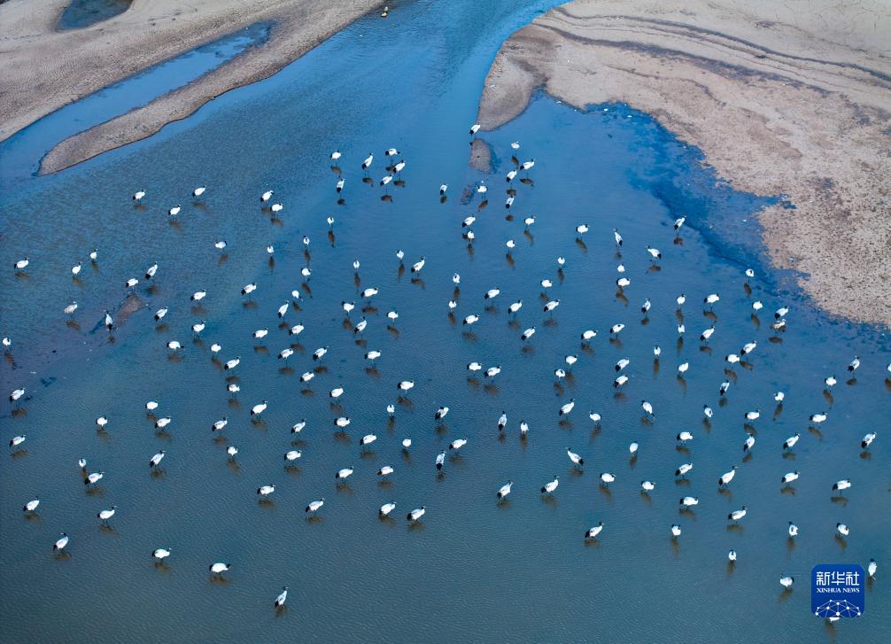 這是在拉薩市林周縣虎頭山水庫拍攝的越冬黑頸鶴(10月24日攝,無(wú)人機照片)。