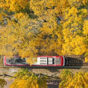 10月24日,一輛電車(chē)行駛在長(cháng)春市春城大街(無(wú)人機照片)。
