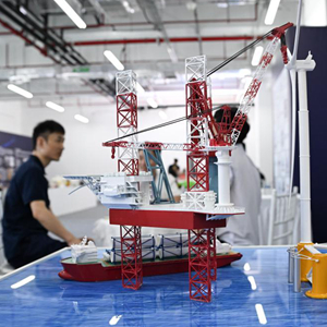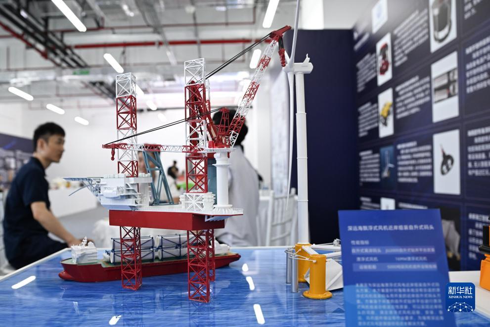 在深海先進(jìn)技術(shù)與裝備展覽上展出的深遠海漂浮式風(fēng)機近岸組裝自升式碼頭(10月25日攝)。