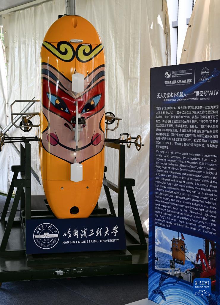在深海先進(jìn)技術(shù)與裝備展覽上展出的全海深無(wú)人潛水器“悟空號”(10月25日攝)。