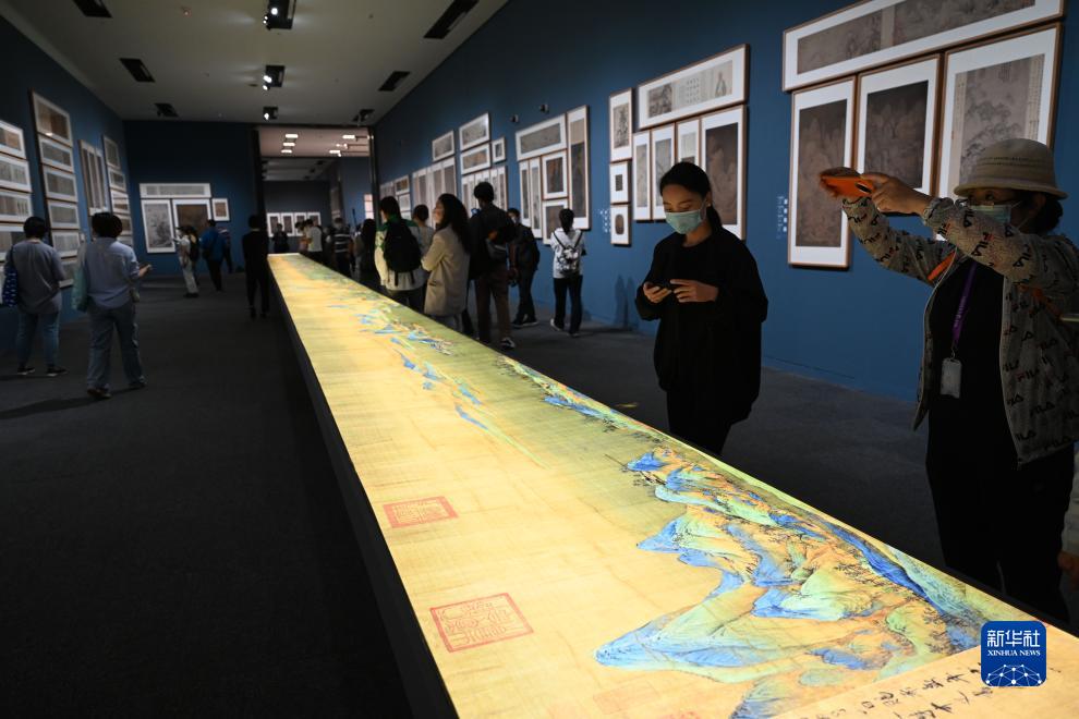 在位于北京的中國國家博物館“盛世修典——‘中國歷代繪畫(huà)大系’成果展”上,觀(guān)眾參觀(guān)放大兩倍的《千里江山圖》燈光特效圖(2022年9月29日攝)。展覽以圖像、文字、視頻、新媒體等多元展示手法,呈現“中國歷代繪畫(huà)大系”所反映的中國古代繪畫(huà)的宏富成就。