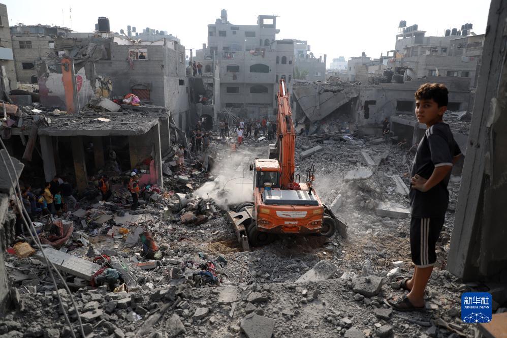 10月25日,在加沙地帶南部城市汗尤尼斯,挖掘機在以色列空襲后的建筑廢墟現場(chǎng)作業(yè)。