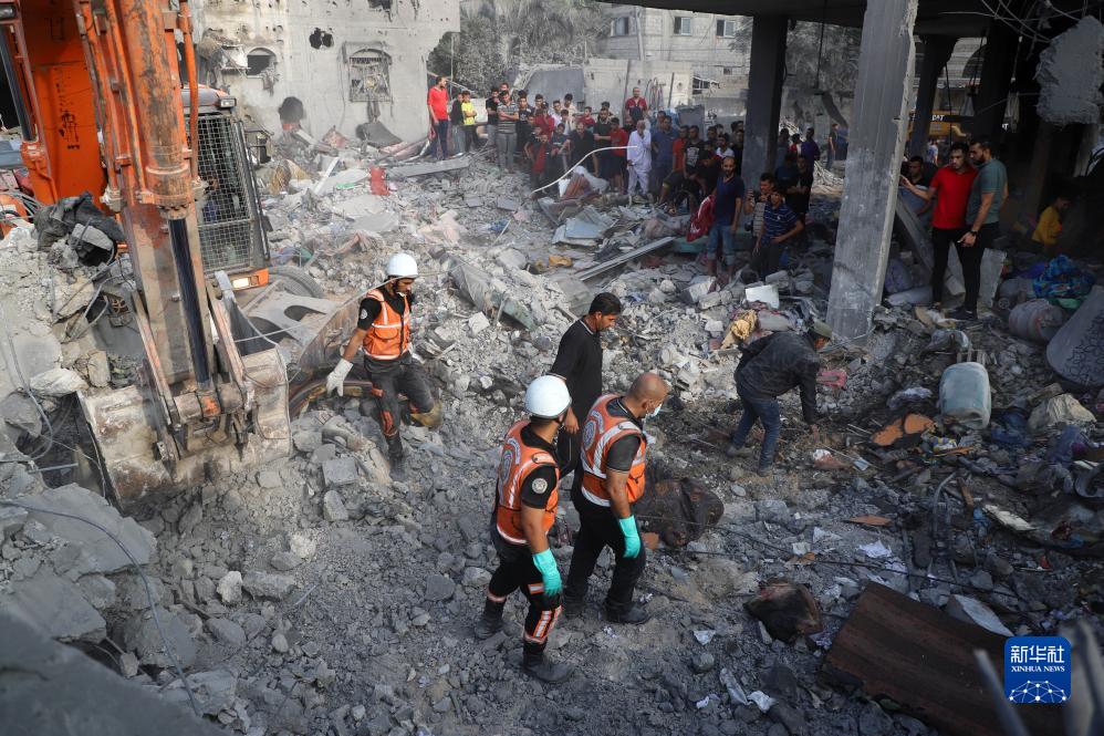 10月25日,在加沙地帶南部城市汗尤尼斯,人們在以色列空襲后的建筑廢墟中搜救。