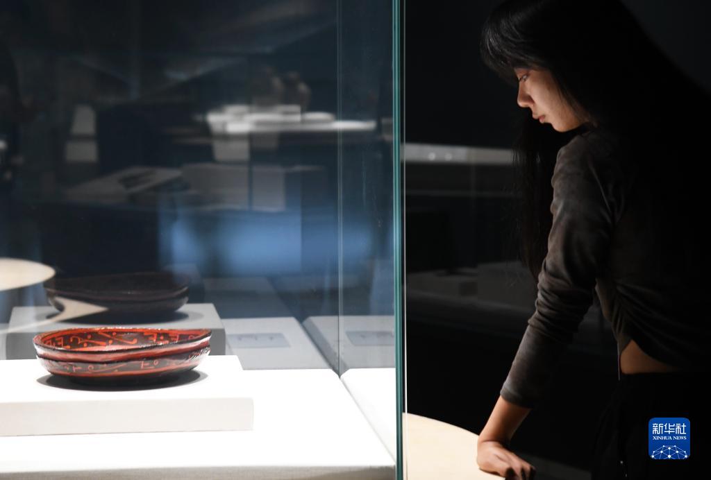 10月25日,觀(guān)眾在秦始皇帝陵博物院觀(guān)看荊州博物館館藏文物鳥(niǎo)紋漆盂。