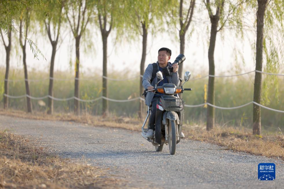 10月24日,韓戰橋騎著(zhù)摩托車(chē)在雄安新區孝義河河口濕地巡護。