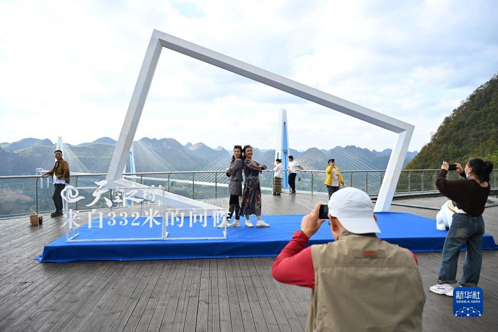 10月25日,游客在貴州省平塘縣“天空之橋”觀(guān)光服務(wù)區拍照留念。