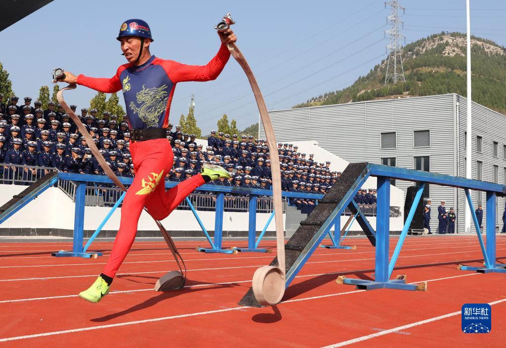 10月25日,消防員在閉幕式上進(jìn)行消防百米障礙演示。