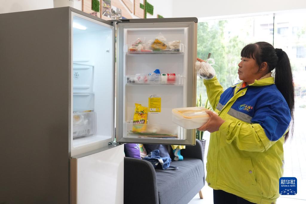 10月25日,在重慶市北碚區云清路“勞動(dòng)者港灣”,一名環(huán)衛工人從冰箱內取出午飯準備加熱。
