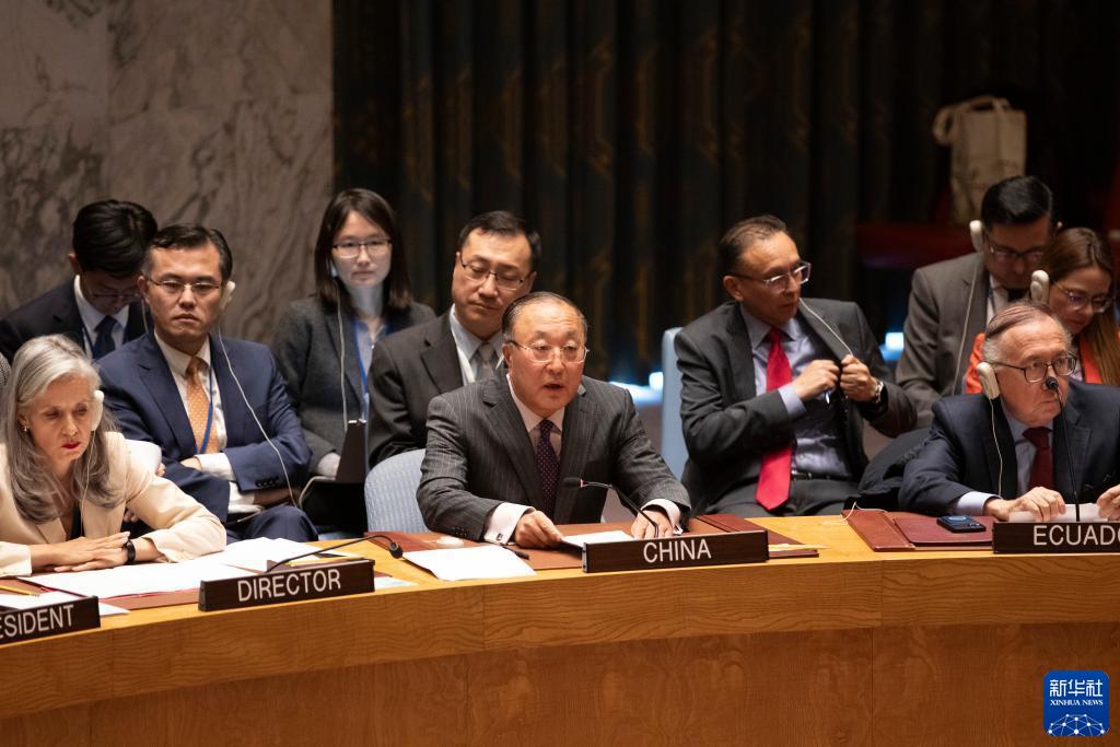 10月25日,在位于紐約的聯(lián)合國總部,中國常駐聯(lián)合國代表張軍(前排中)在安理會(huì )表決涉巴以沖突的決議草案后作解釋性發(fā)言。