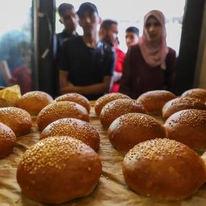 10月25日,在加沙地帶南部城市汗尤尼斯,人們在一家烘焙店外排隊購買(mǎi)面包。