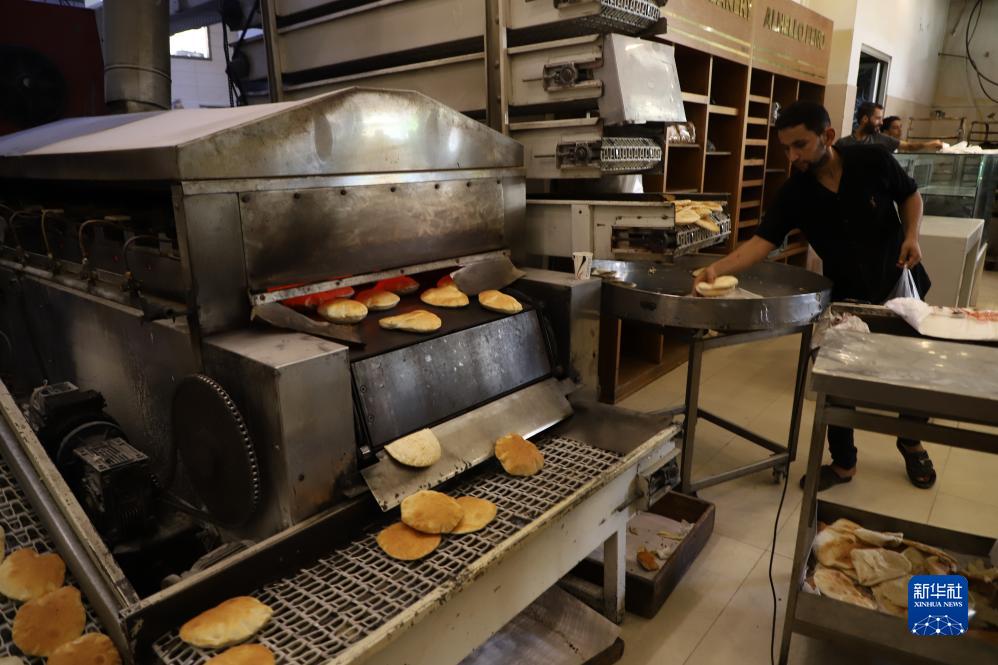 10月25日,在加沙地帶南部城市汗尤尼斯,工作人員在一家烘焙店內制作食品。