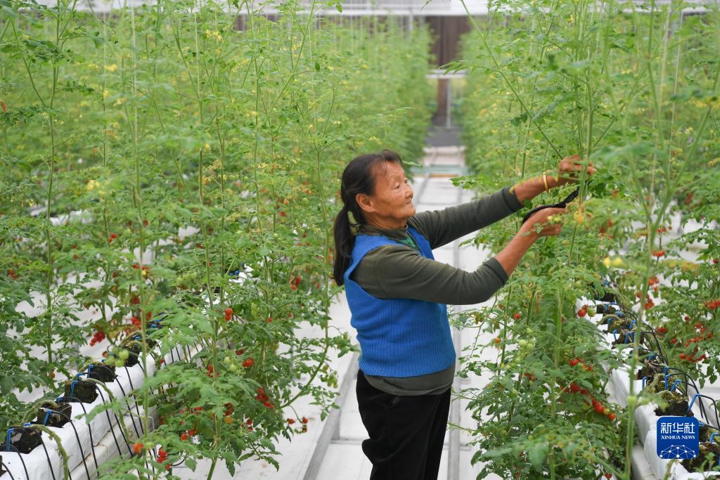 10月25日,工作人員在魯渝(壽光)蔬菜現代產(chǎn)業(yè)園南門(mén)科技示范園西紅柿種植大棚內修枝。