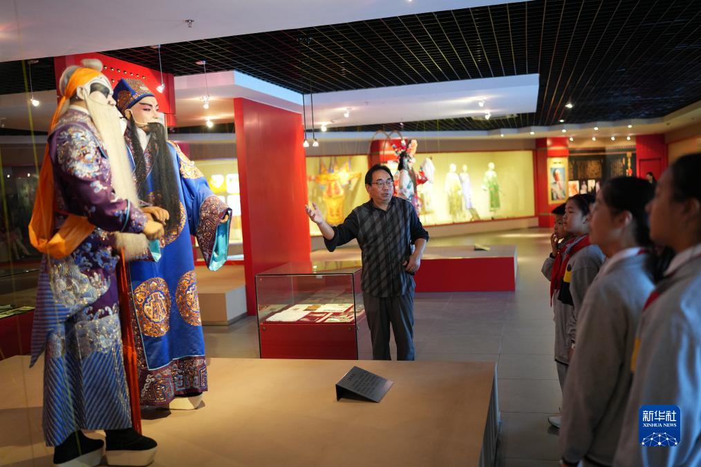 10月25日,在位于湖州市環(huán)渚街道的京劇服飾藝術(shù)館,湖州職業(yè)技術(shù)學(xué)院的老師給前來(lái)參觀(guān)的小學(xué)生講解館藏的京劇戲服。