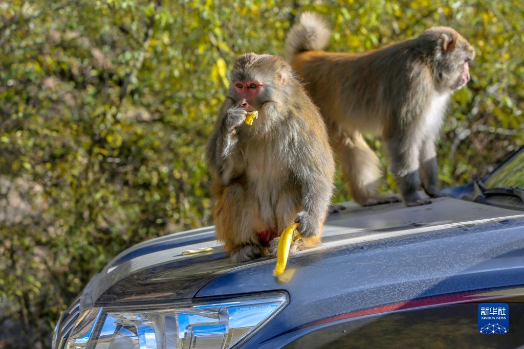 藏獼猴蹲在車(chē)頂上吃游客喂食的香蕉(10月25日攝)。