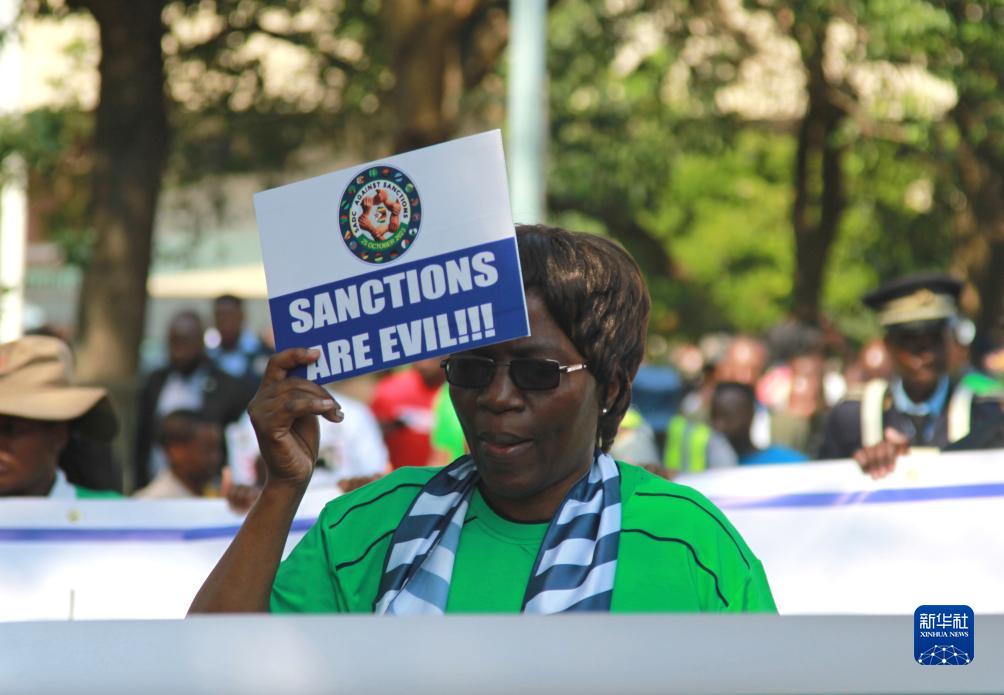 10月25日,在津巴布韋首都哈拉雷,一名女子手持標語(yǔ)參加抗議西方非法制裁的游行。