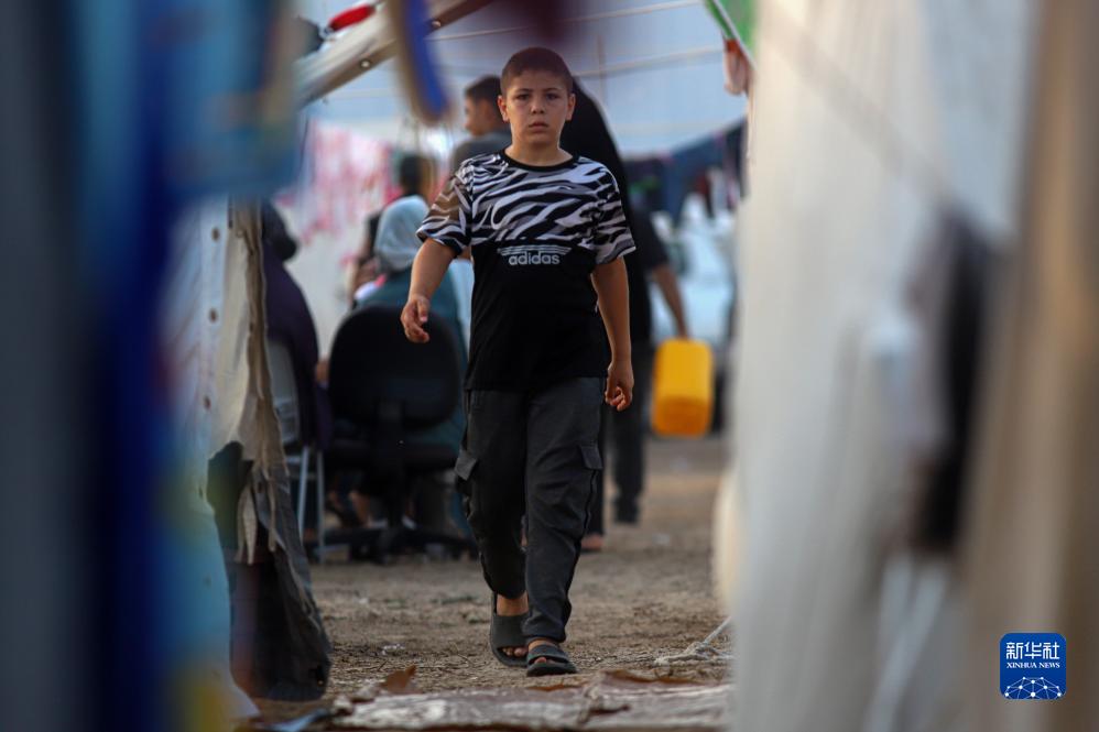 10月25日,兒童走在加沙地帶南部一處收容流離失所巴勒斯坦人的臨時(shí)營(yíng)地內。