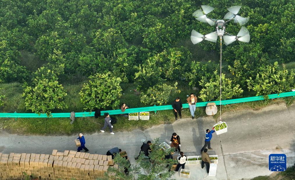 10月24日,湖北省宜昌市秭歸縣歸州鎮屈原廟村村民用無(wú)人機運送收獲的柑橘(無(wú)人機照片)。