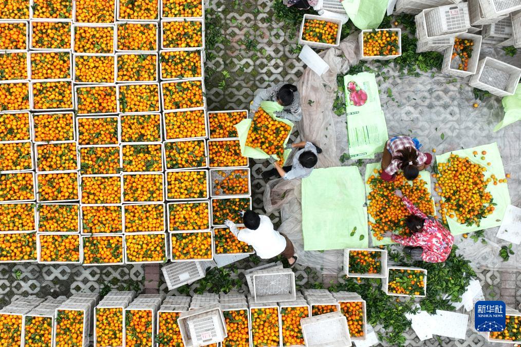 10月24日,四川省廣安市武勝縣龍女鎮青巖村果農在挑選砂糖桔裝框(無(wú)人機照片)。