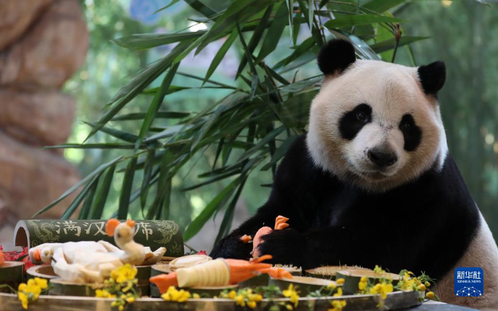 10月27日是國際熊貓日。廣州長(cháng)隆野生動(dòng)物世界保育員為大熊貓“酷酷”準備了豐盛的“滿(mǎn)漢全席”,包括“鳳尾魚(yú)翅”“干連福海參”“羅漢大蝦”等八大菜式。