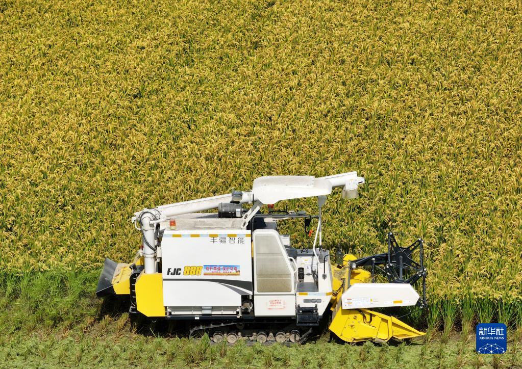 10月27日,無(wú)人駕駛機械在江蘇省南通市通州區十總鎮育民村高標準農田收割水稻(無(wú)人機照片)。