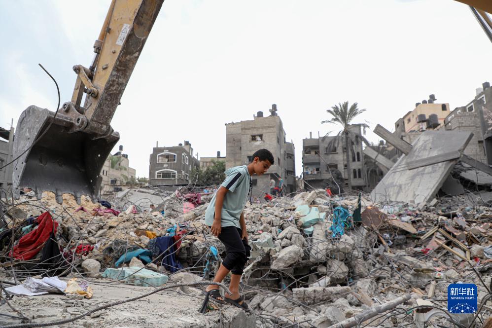 10月27日,在加沙地帶南部城市汗尤尼斯,一個(gè)男孩查看建筑廢墟。