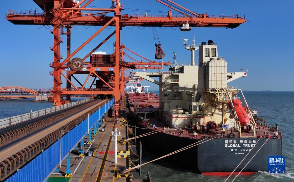 10月27日,一艘輪船靠泊在唐山港曹妃甸港區礦石碼頭卸載(無(wú)人機照片)。