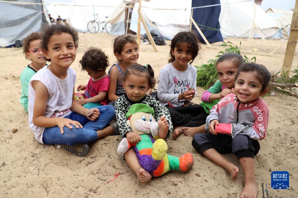 這是10月27日在加沙地帶南部城市汗尤尼斯一處臨時(shí)營(yíng)地內拍攝的巴勒斯坦兒童。