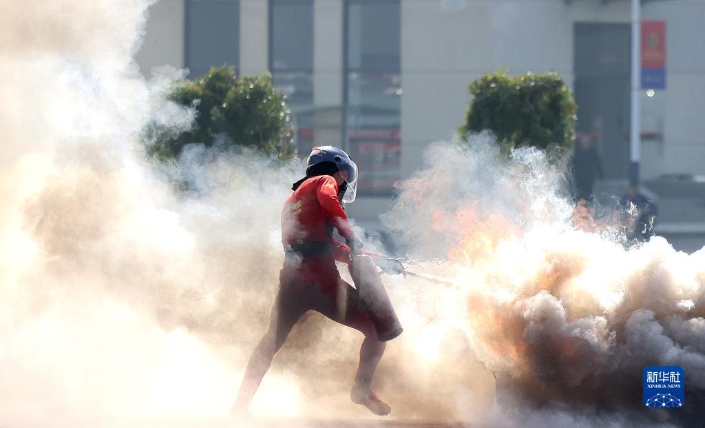 10月25日,消防員在閉幕式上演示撲滅油池火。