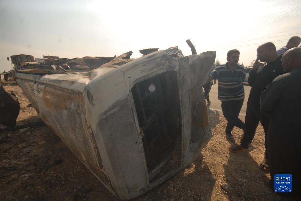 10月28日,人們站在埃及布海拉省多車(chē)相撞事故現場(chǎng)的損毀車(chē)輛旁。