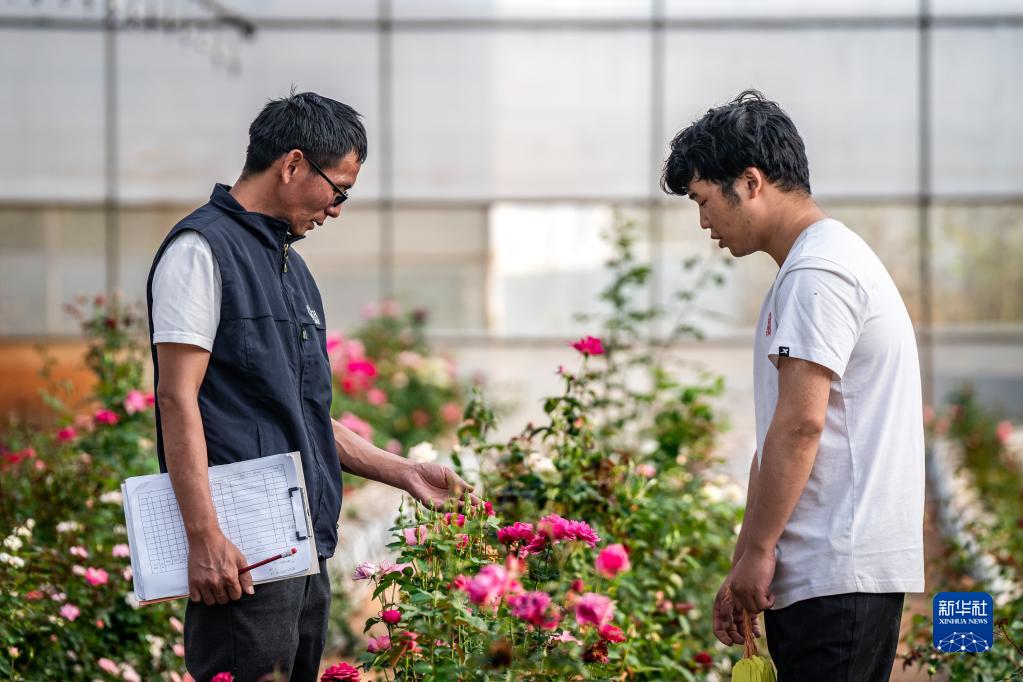 在云南省安寧市現代農業(yè)園區玫瑰種植示范園,技術(shù)員田連通(左)在和同事交流(10月20日攝)。