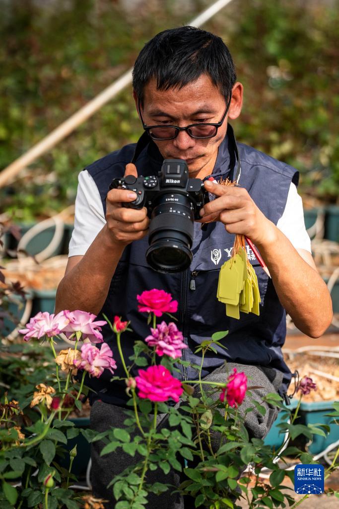 在云南省安寧市現代農業(yè)園區玫瑰種植示范園,技術(shù)員田連通拍攝玫瑰花(10月20日攝)。