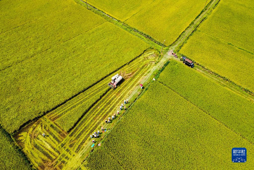 8月10日,在位于婁底市雙峰縣印塘鄉鹽井灣村的“稻再油”示范片,農機手駕駛收割機收割頭季稻谷(無(wú)人機照片)。