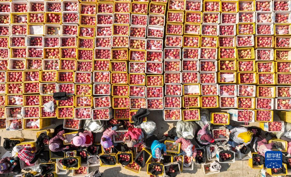 10月28日,在山東省榮成市夏莊鎮一處蘋(píng)果園,果農們在分揀、裝運蘋(píng)果(無(wú)人機照片)。