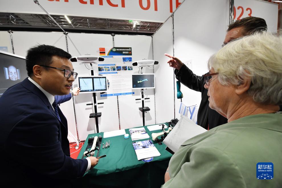 10月28日,在德國紐倫堡,國家骨科與運動(dòng)康復臨床醫學(xué)研究中心的工作人員(左)向參觀(guān)者介紹一款智能手術(shù)導航系統。