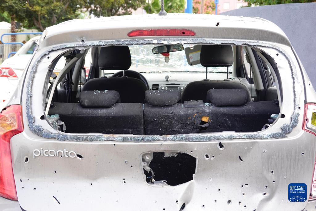 這是10月29日在以色列南部城市阿什杜德拍攝的遭火箭彈襲擊的車(chē)輛。