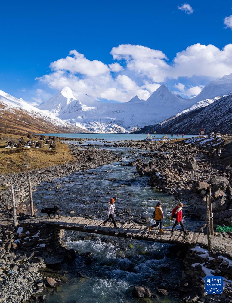游客徒步經(jīng)過(guò)薩普雪山腳下的木橋(10月28日攝)。