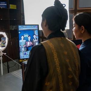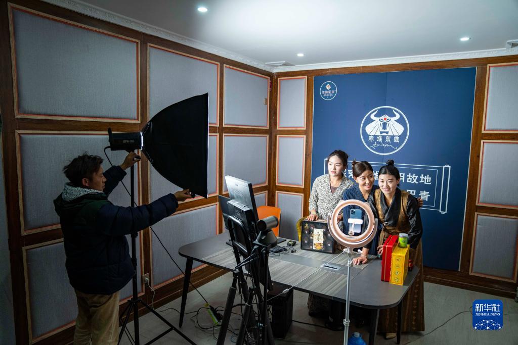 工作人員在巴青縣“赤堆東雄”網(wǎng)紅直播間調試燈光設備(10月29日攝)。