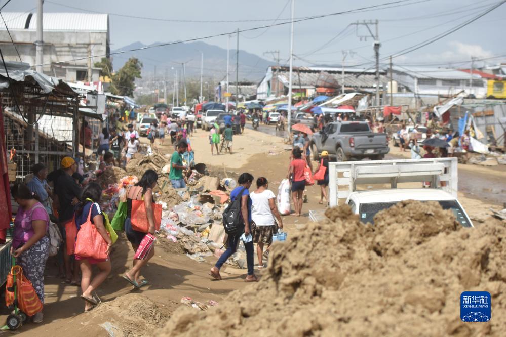 10月28日,在墨西哥格雷羅州阿卡普爾科,人們走在被洪水損壞的道路上。