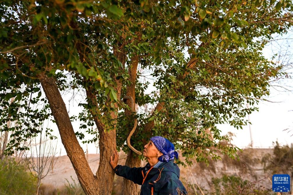 10月27日,德力格在查看當年和蘇和在這里種下的第一棵樹(shù)。如今這棵樹(shù)已枝繁葉茂。