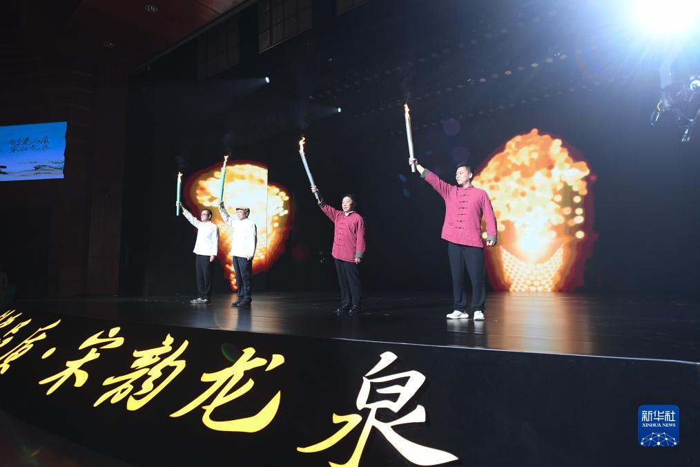 10月30日,龍泉的青瓷和寶劍制作技藝傳承人在開(kāi)幕式上手舉薪火。